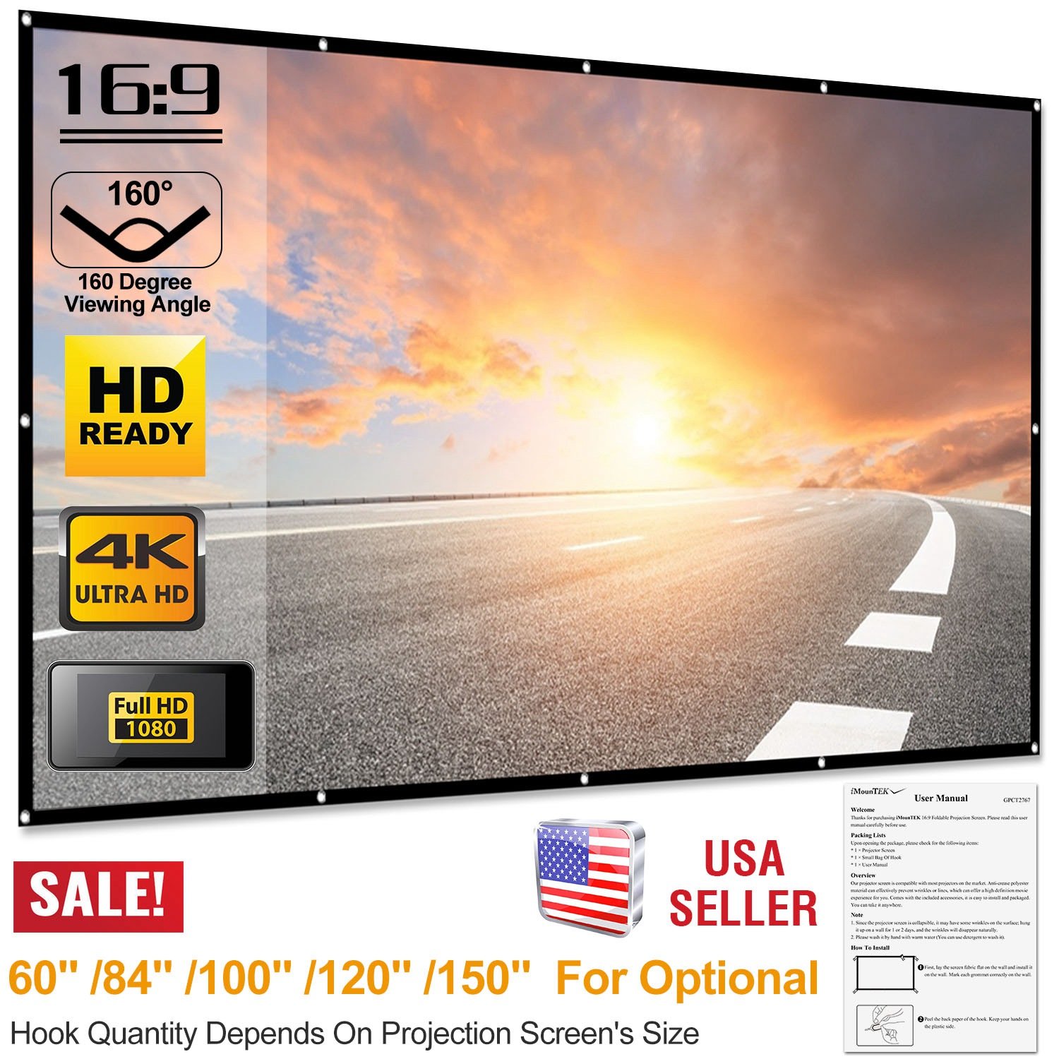 Our projector screen is compatible with most projectors on the market. Anti-crease polyester material can effectively prevent wrinkles or lines, which can offer a high definition movie experience for you. Comes with the included hook accessories, it is easy to install and packaged. You can take it anywhere.